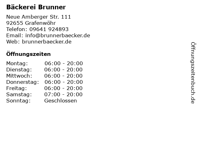| Öffnungszeiten Bäckerei Brunner in Grafenwöhr anzeigen | |