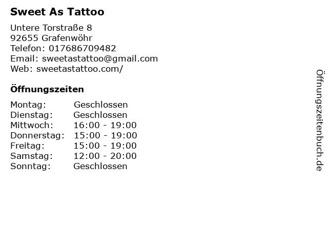 | Öffnungszeiten Sweet As Tattoo in Grafenwöhr anzeigen | |