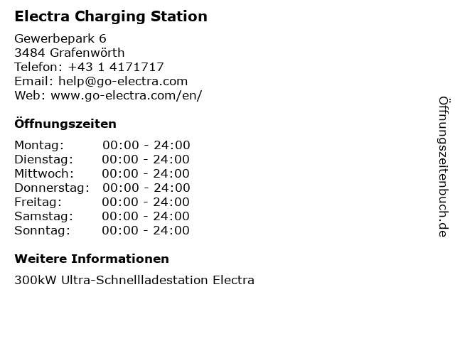 | Öffnungszeiten Electra Charging Station in Grafenwörth anzeigen | |