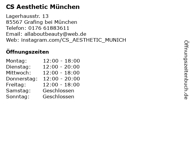 1 CS Reifen- und Teileservice Christoph Stephan (Entfernung: 16,89 km) Kirchmaierstr. 9a, 83556 Griesstätt 2 Apotheke und Aesthetic-Care Kosmetikstudio (Entfernung: 18,67 km) Bahnhofstr. 2, 83052 Bruckmühl, Mangfall 3 All about Beauty - Kosmetik & Permanent Make up (Entfernung: 0,01 km) Lagerhausstraße 13, 85567 Grafing 6 Hans-Günter Schmidt HGS CS Hans Schmidt Consulting (Entfernung: 22,31 km) Hamannstr. 59, 81739 München |