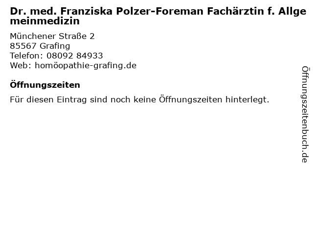 | Dr. med. Franziska Polzer-Foreman Fachärztin f. Allgemeinmedizin anrufen | |