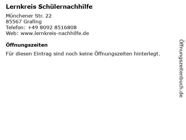 | Öffnungszeiten Lernkreis Schülernachhilfe in Grafing anzeigen | |