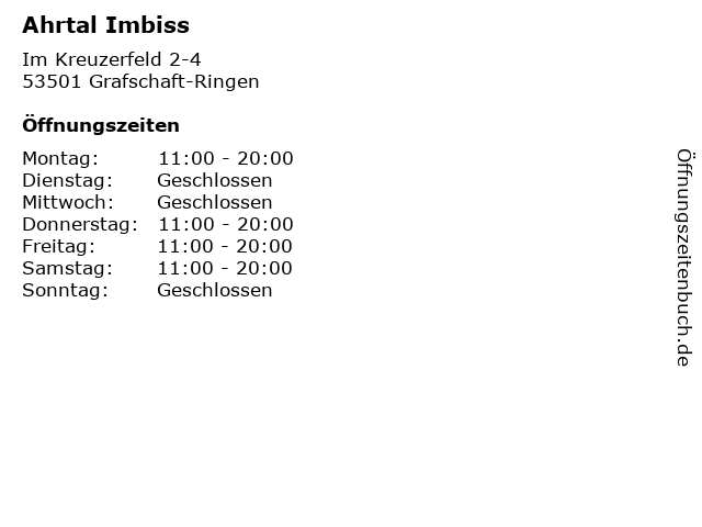 | Öffnungszeiten Ahrtal Imbiss in Grafschaft-Ringen anzeigen | |