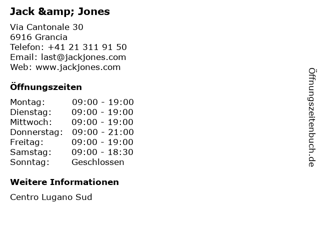 | Öffnungszeiten Jack & Jones in Grancia anzeigen | |