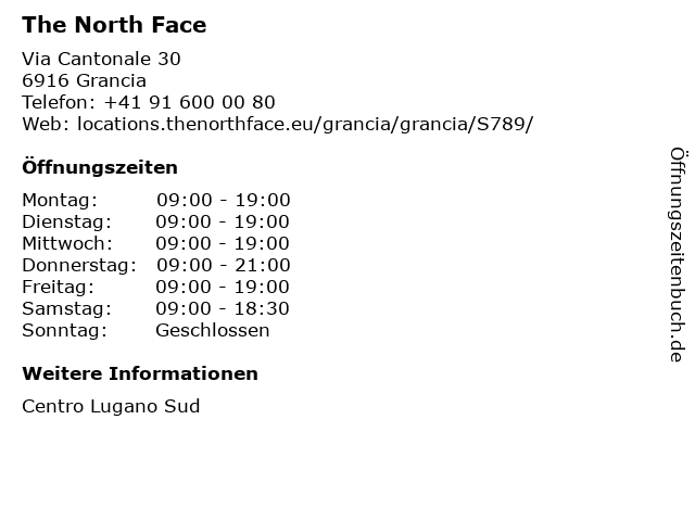 | Telefonnummer The North Face in Grancia (+41 91 600 00 80) anrufen | |