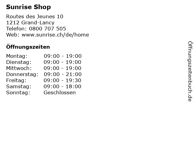 | Öffnungszeiten Sunrise Shop in Grand-Lancy anzeigen | |