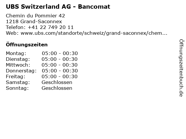 Öffnungszeiten UBS Switzerland AG - Bancomat in Grand-Saconnex anzeigen