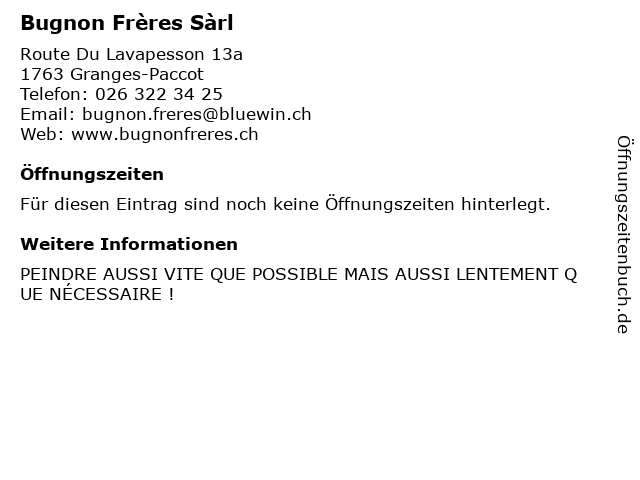 | Öffnungszeiten Bugnon Frères Sàrl in Granges-Paccot anzeigen | |