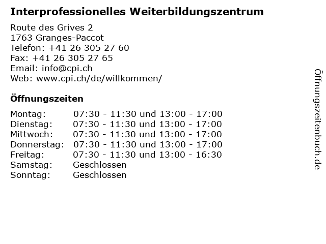 1 IWZ interprofessionelles Weiterbildungszentrum (Entfernung: 0,00 km) route des Grives 2, 1763 Granges-Paccot 5 Gemeindeverwaltung Administration Communale Renan (Entfernung: 38,20 km) Rue du Collège 5, 2616 Renan 6 Gemeindeverwaltung Administration Communale Saint-Imier (Entfernung: 38,87 km) Rue Agassiz 4, 2610 Saint-Imier |