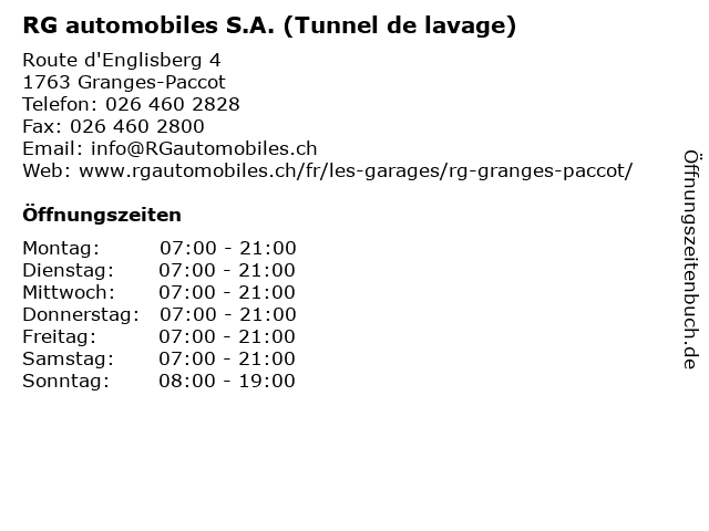 3 RG automobiles S.A. (Dépôt et retrait des clés) (Entfernung: 0,00 km) Route d'Englisberg 4, 1763 Granges-Paccot 5 RG automobiles SA (Centre d´occasion) (Entfernung: 0,00 km) Route d'Englisberg 4, 1763 Granges-Paccot 6 |