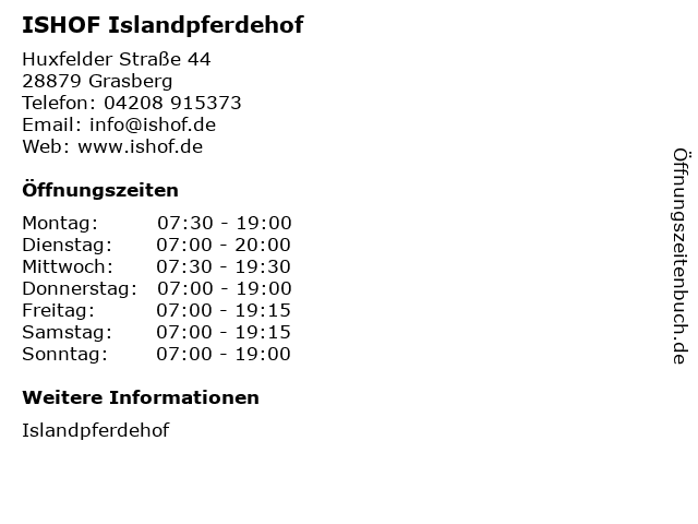 | Öffnungszeiten ISHOF Islandpferdehof in Grasberg anzeigen | |
