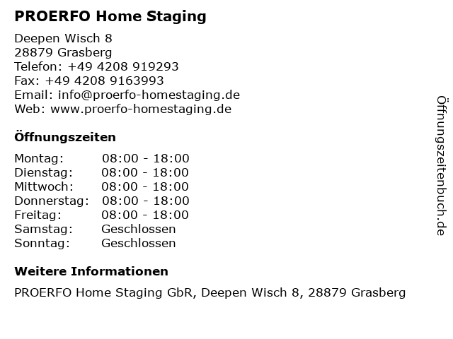 | Öffnungszeiten PROERFO Home Staging in Grasberg anzeigen | |