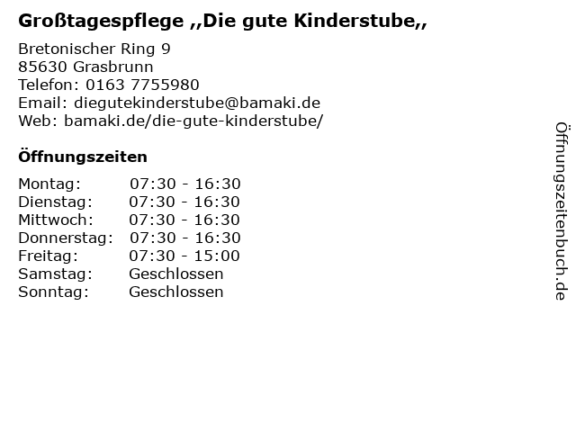 2 Großtagespflege – Die bilinguale Kinderstube (Entfernung: 2,86 km) St Ulrich-Platz 4, 85630 Grasbrunn 3 Kindertagespflege & Großtagespflege der Nachbarschaftshilfe Haar e. V. (Bürozeiten) (Entfernung: 3,09 km) Kirchenstraße 3, 85540 Haar 6 |