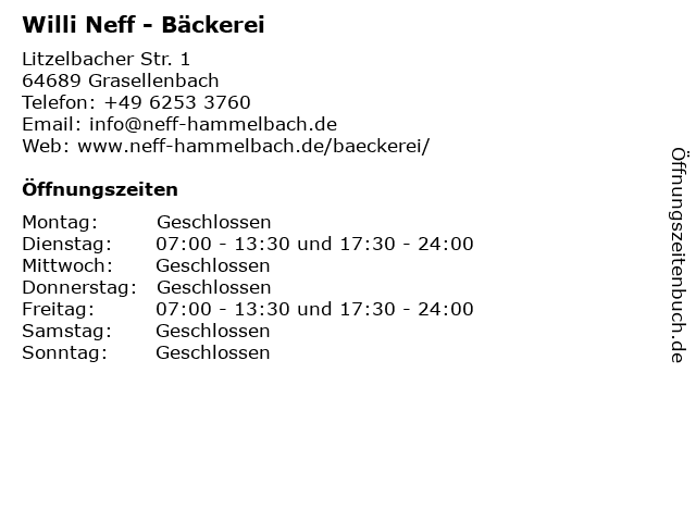 | Öffnungszeiten Willi Neff - Bäckerei in Grasellenbach anzeigen | |