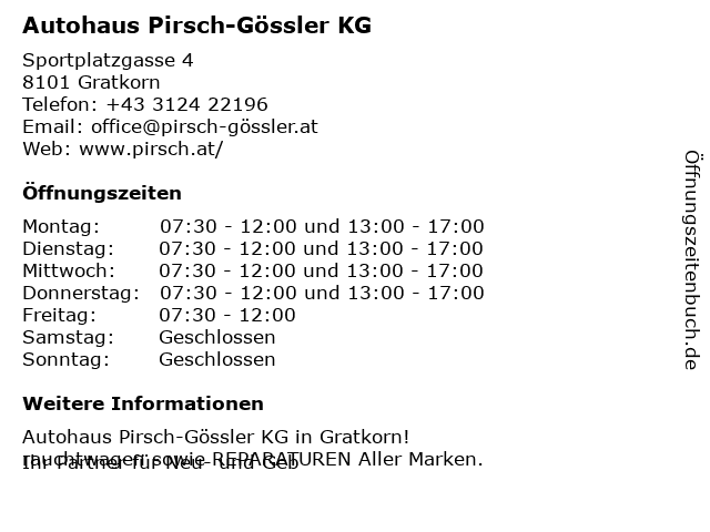 | Öffnungszeiten Autohaus Pirsch-Gössler KG in Gratkorn anzeigen | |