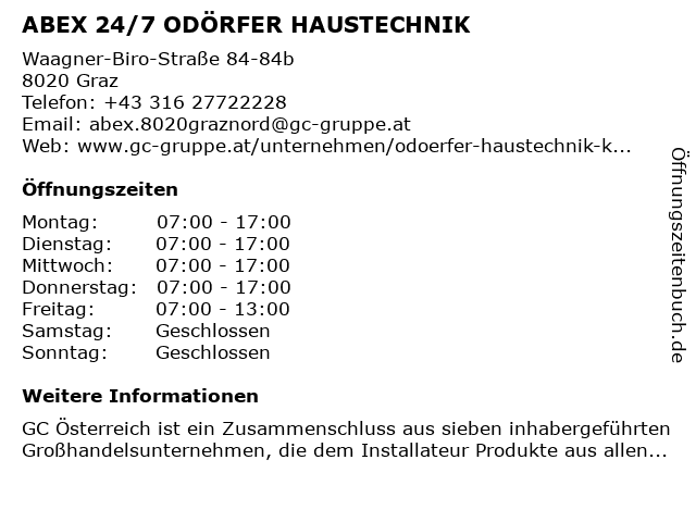 | Öffnungszeiten ABEX 24/7 ODÖRFER HAUSTECHNIK in Graz anzeigen | |