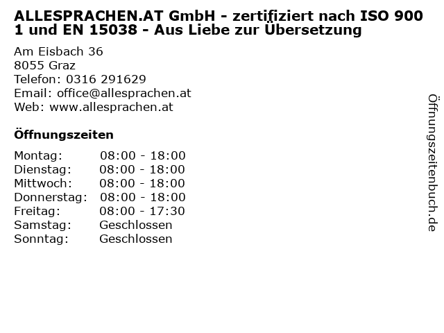 1 ALLESPRACHEN.AT GmbH - zertifiziert nach ISO 9001 und EN 15038 (Entfernung: 0,01 km) Am Eisbach 36a, 8055 Graz 6 STUNT.AT Adrenalinpark (Mai-Juni, Sept) (Entfernung: 4,85 km) Thalerhofstraße 85, 8141 Unterpremstätten |
