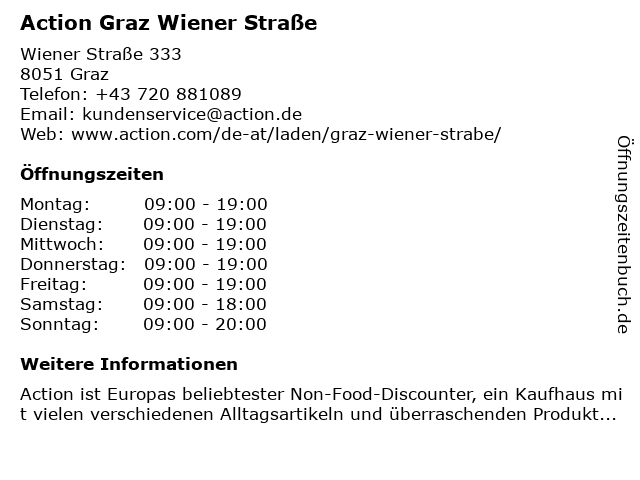 | Öffnungszeiten Action Graz Wiener Straße in Graz anzeigen | |
