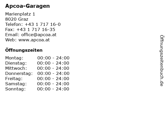 | Öffnungszeiten Apcoa-Garagen in Graz anzeigen | |