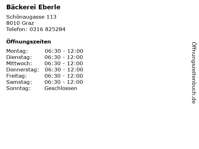 | Öffnungszeiten Bäckerei Eberle in Graz anzeigen | |