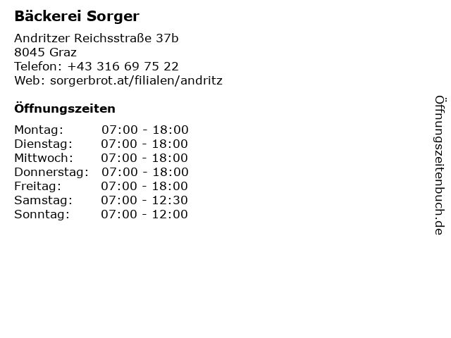 | Öffnungszeiten Bäckerei Sorger in Graz anzeigen | |