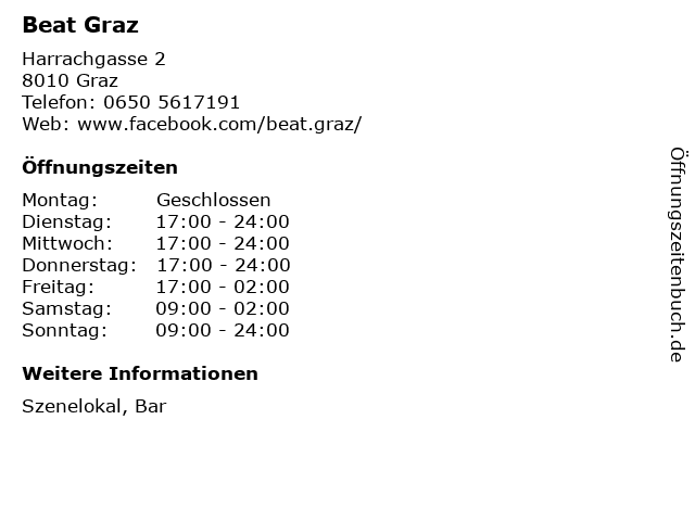 | Öffnungszeiten Beat Graz in Graz anzeigen | |