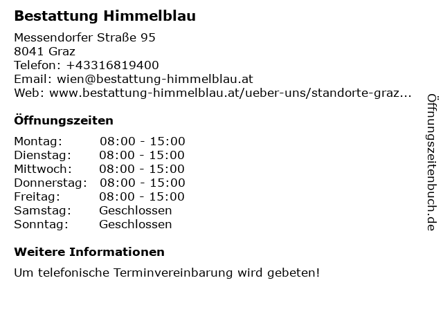 | Öffnungszeiten Bestattung Himmelblau in Graz anzeigen | |