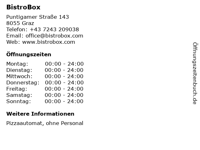 Öffnungszeiten BistroBox in Graz anzeigen | |
