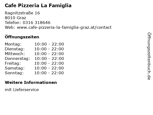 | Öffnungszeiten Cafe Pizzeria La Famiglia in Graz anzeigen | |