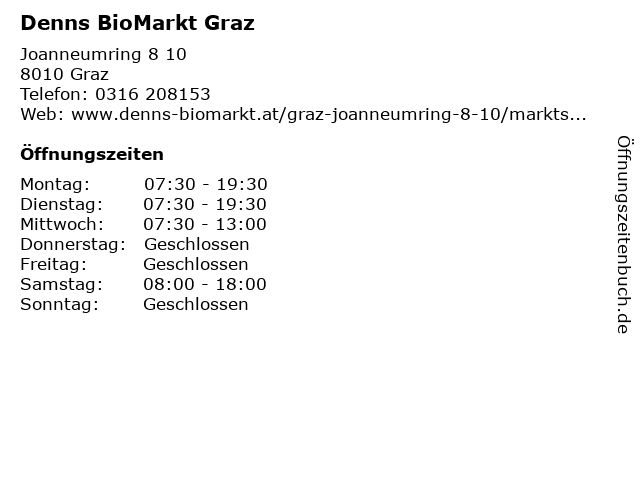 | Öffnungszeiten Denns BioMarkt Graz in Graz anzeigen | |