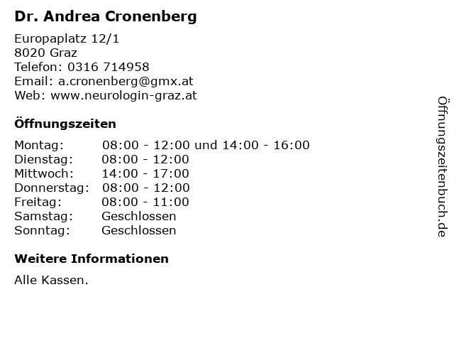 | Öffnungszeiten Dr. Andrea Cronenberg in Graz anzeigen | |