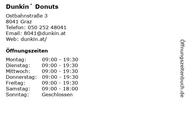 | Öffnungszeiten Dunkin´ Donuts in Graz anzeigen | |