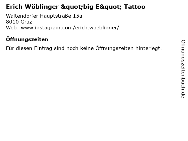 | Öffnungszeiten Erich Wöblinger "big E" Tattoo in Graz anzeigen | |