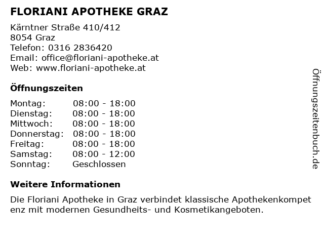 | Öffnungszeiten FLORIANI APOTHEKE GRAZ in Graz anzeigen | |