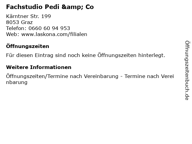 | Öffnungszeiten Fachstudio Pedi & Co in Graz anzeigen | |