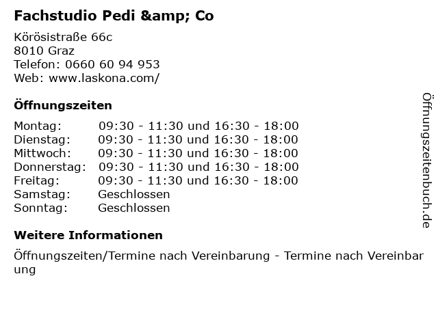 | Öffnungszeiten Fachstudio Pedi & Co in Graz anzeigen | |