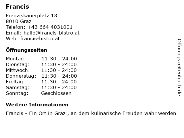 | Öffnungszeiten Francis in Graz anzeigen | |