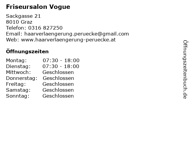 | Öffnungszeiten Friseursalon Vogue in Graz anzeigen | |