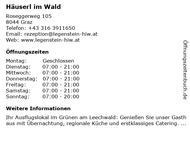 | Öffnungszeiten Häuserl im Wald in Graz anzeigen | |