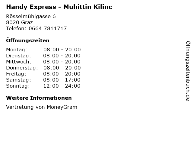 | Öffnungszeiten Handy Express - Muhittin Kilinc in Graz anzeigen | |