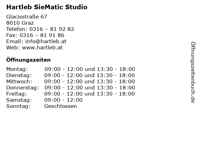 | Öffnungszeiten Hartleb SieMatic Studio in Graz anzeigen | |