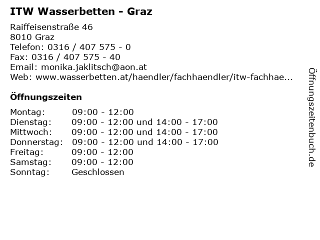 | Öffnungszeiten ITW Wasserbetten - Graz in Graz anzeigen | |