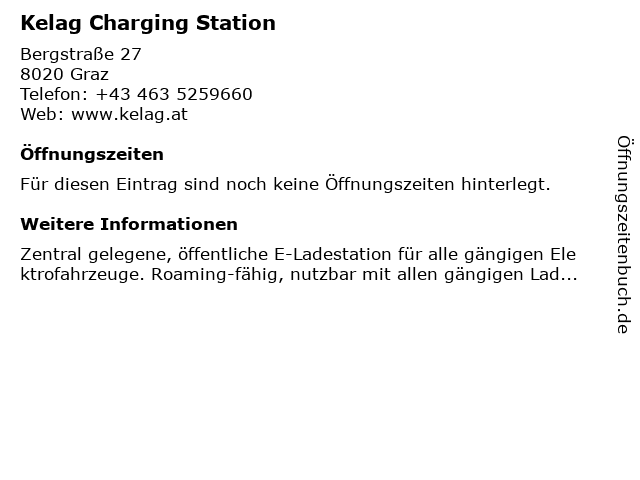 | Öffnungszeiten Kelag Charging Station in Graz anzeigen | |