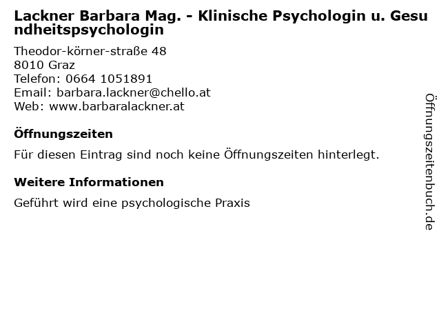 | Lackner Barbara Mag. - Klinische Psychologin u. Gesundheitspsychologin anrufen | |