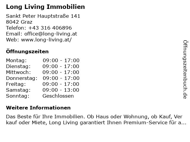 | Öffnungszeiten Long Living Immobilien in Graz anzeigen | |