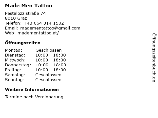 | Öffnungszeiten Made Men Tattoo in Graz anzeigen | |