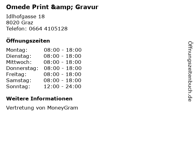 | Öffnungszeiten Omede Print & Gravur in Graz anzeigen | |
