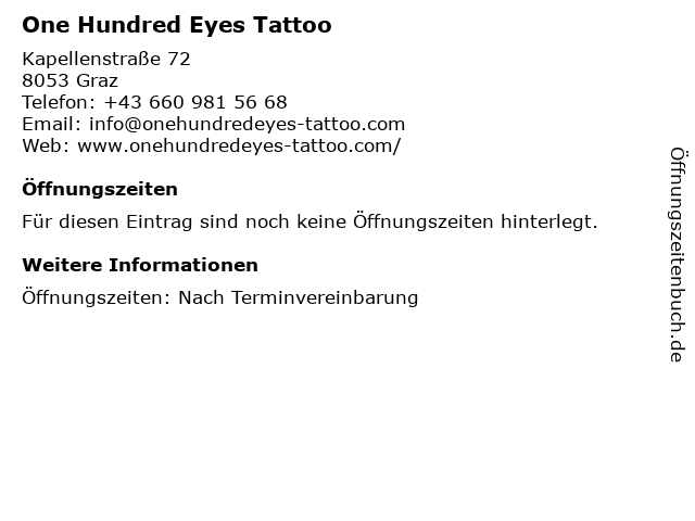 | Öffnungszeiten One Hundred Eyes Tattoo in Graz anzeigen | |