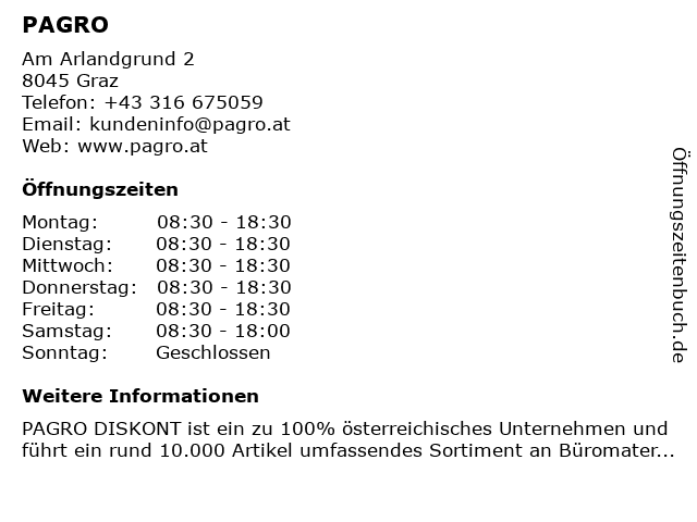 | Öffnungszeiten PAGRO in Graz anzeigen | |
