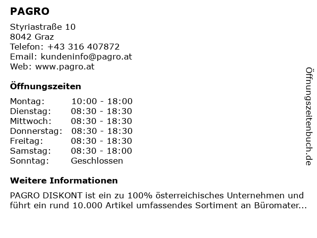 | Öffnungszeiten PAGRO in Graz anzeigen | |